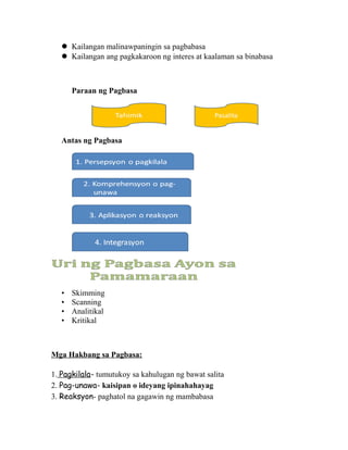 Ayon sa kanya and editor-in-chief ng The American Heritage at awtor ng Your Heritage Dictionary of Words ang pagbasa ang ang pagkilala sa kahulugan ng mga nakasulat na salita. Oo mahalaga na pag-aralan ang ibat ibang uri ng teksto ng sa ganon bilang mambabasa ay may ideya tayo kung ano ang layunin at patutunguhan ng teksto na ating. 1 Kasanayan sa Pagbasa 2.
