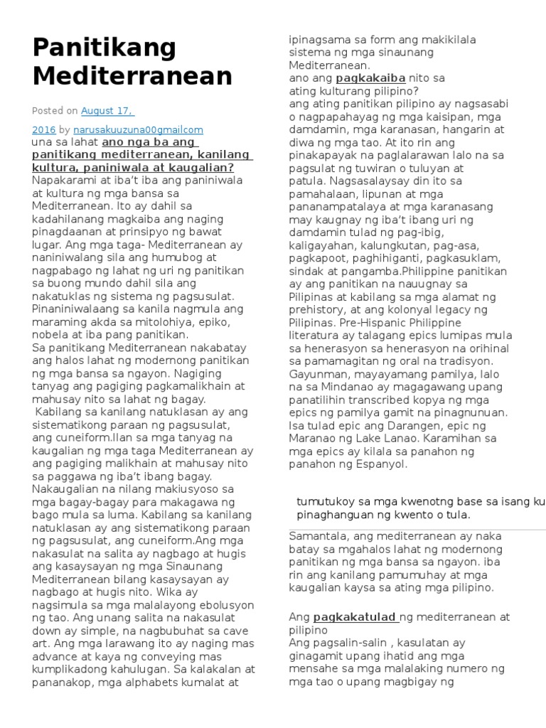Ang Panitikang Mediterranean 2016. Pahalagahan din ang paraan o estilo ng. Ala min Kompetensing Lilinangin Nakabubuo ng isang suring-basa sa alinmang akdang pampanitikang Mediterranian.