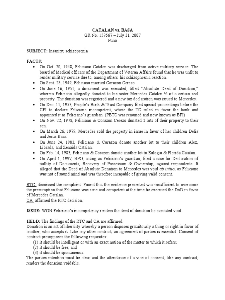 Digest catalan vs basa g.r no 159567. 159567 July 31 2007 2. 159567 Incompetency Case Petitioners. Feliciano Catalan was discharged from military service due to his schizophrenia inOctober 1948.